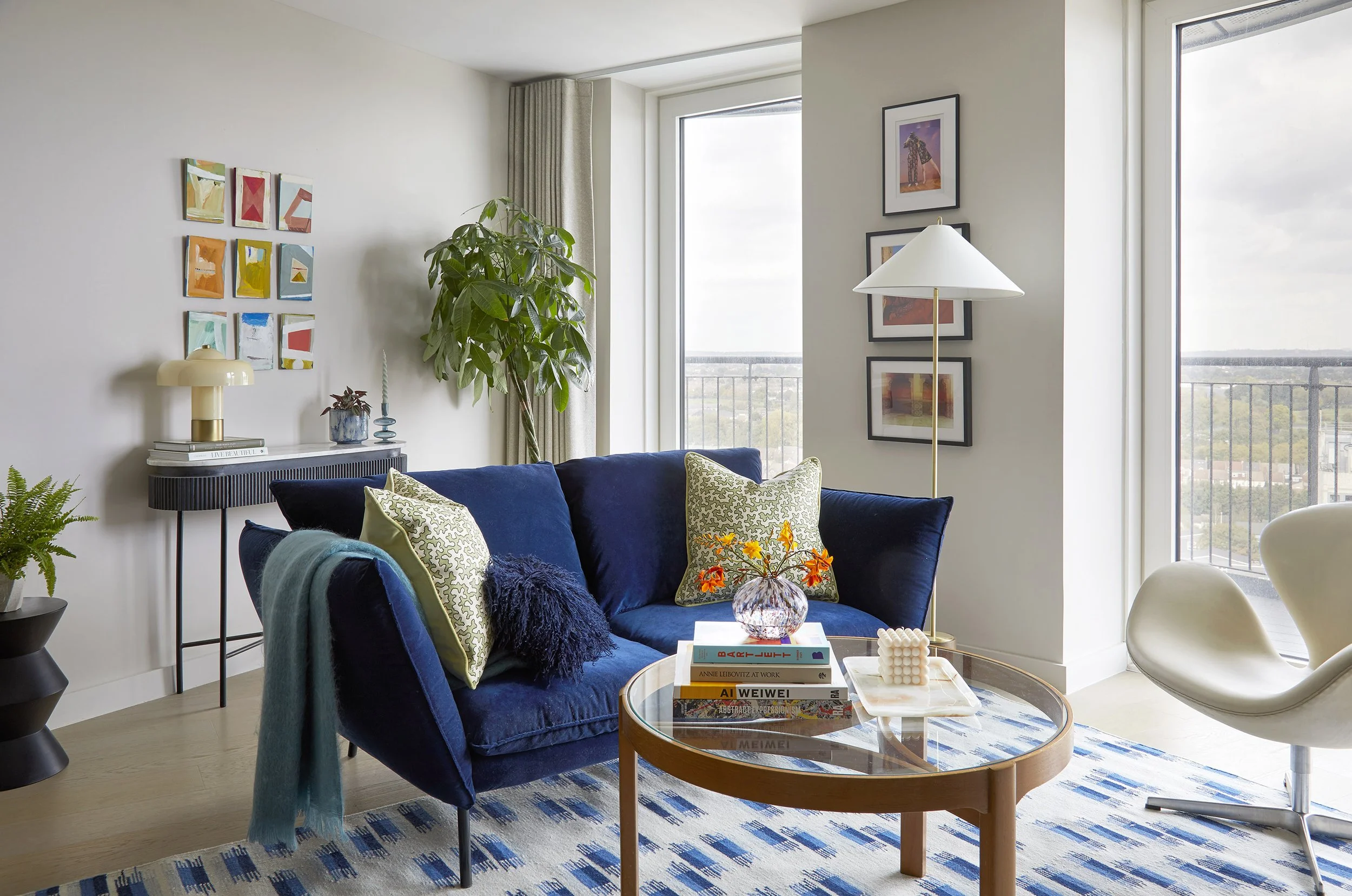 1. Varying heights create interest, taller lamps frame the large window, taking your gaze upwards. shorter lamps work in seated areas.